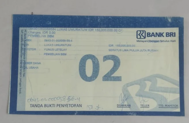 Bukti Kwitansi Pengiriman Uang Rp.150 Juta ke Rekening BRI Milik Lukas Uwuratuw dari Pengirim YL, Tahun 2026 lalu.