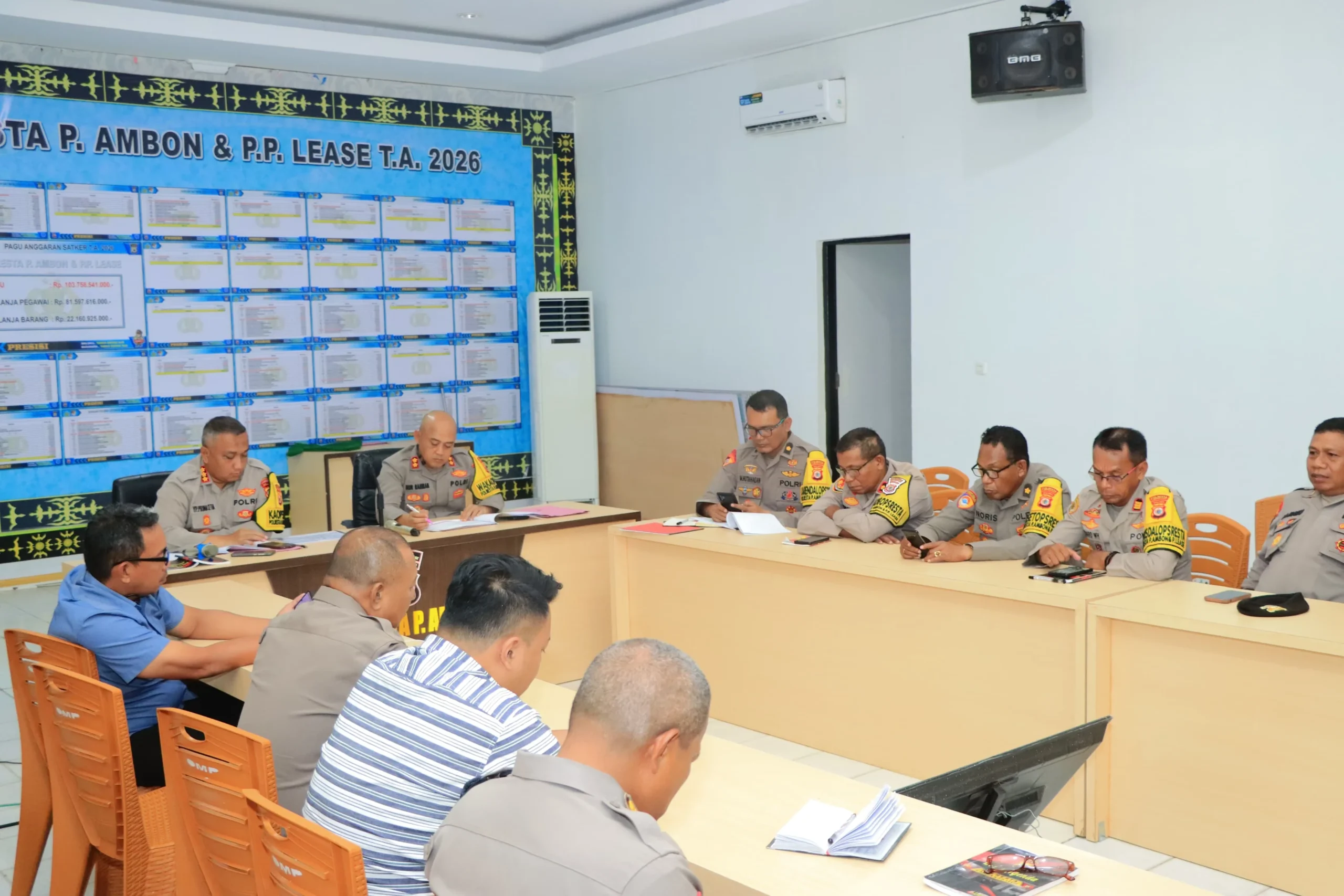 Evaluasi pelaksanaan operasi (Anev) dilaksanakan di Aula Mapolresta Ambon, Rabu (25/3/2026), dipimpin Kapolresta Ambon dan Pulau-Pulau Lease, Komisaris Besar Polisi Dr. Yoga Putra Prima Setya, serta dihadiri pejabat utama dan seluruh perwira jajaran.