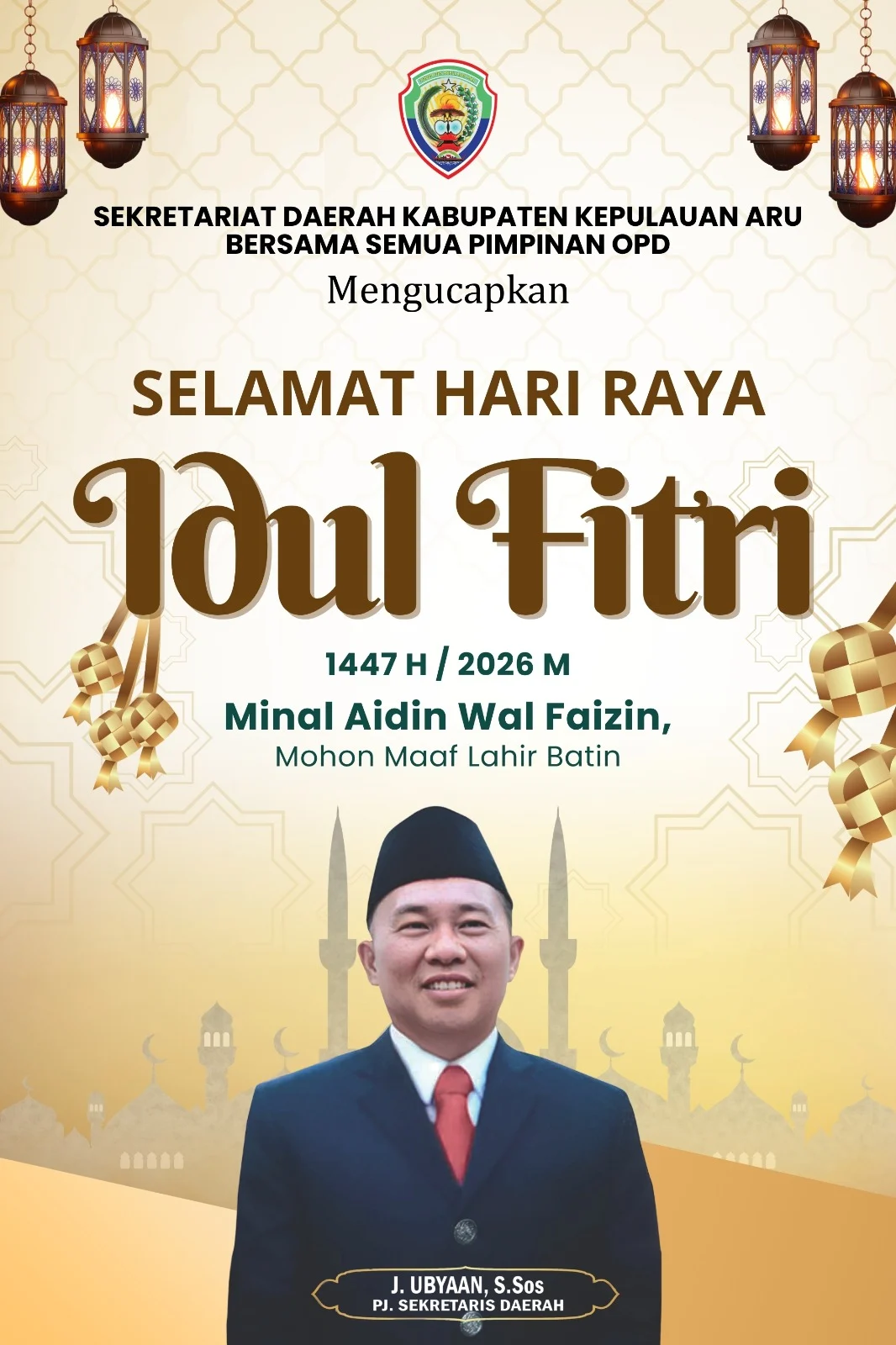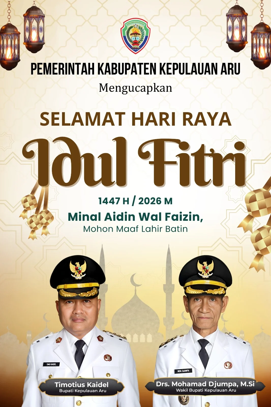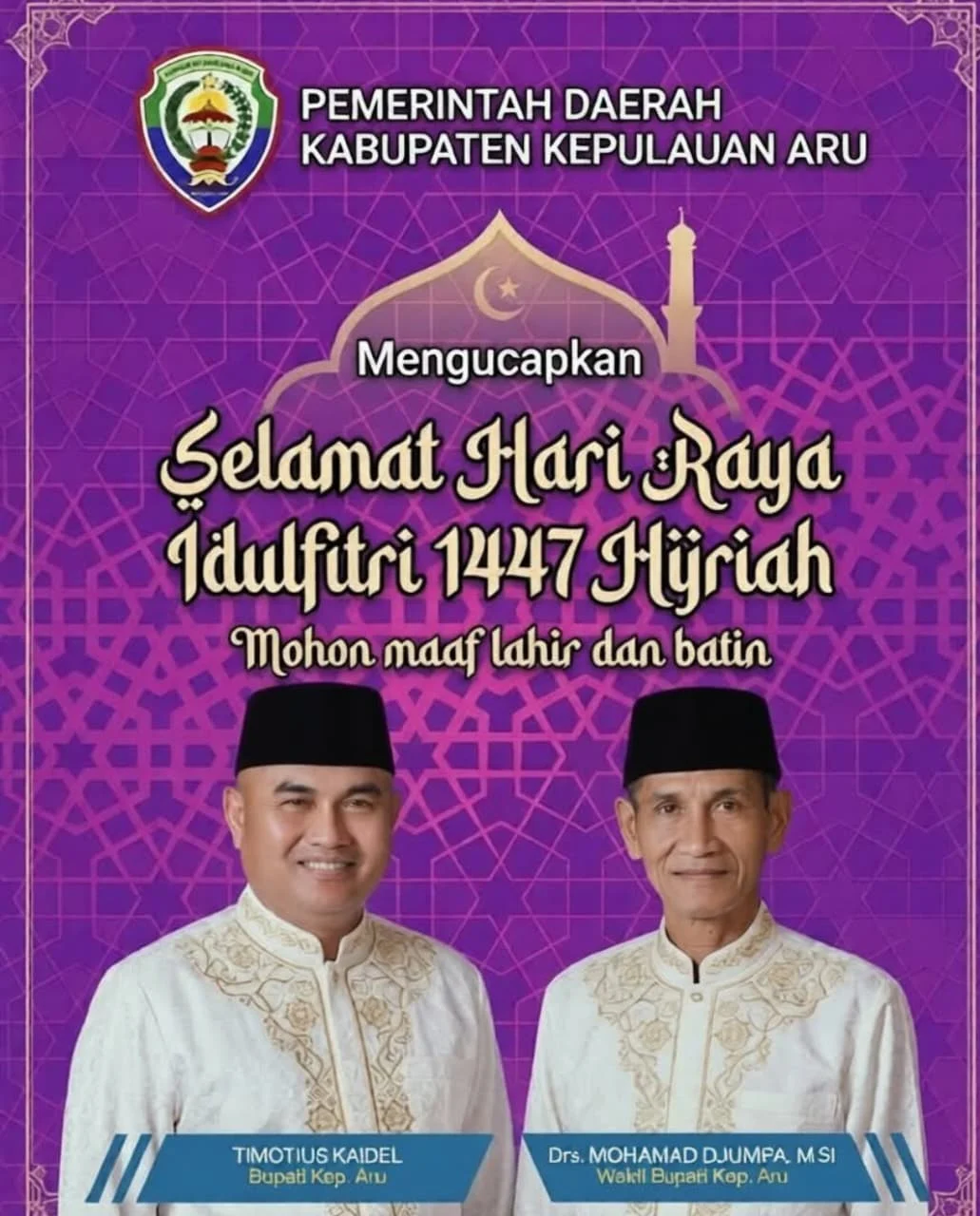 Beranda Pemda Aru Pemkab Kepulauan Aru Mengucapkan Selamat Hari Raya Idul Fitri 1 Syawal 1447 H/2026 M. Minal Aidzin Wal Faidzin, Mohon Maaf Lahir dan Batin Pemda AruPemkab Kepulauan Aru Mengucapkan Selamat Hari Raya Idul Fitri 1 Syawal 1447 H/2026 M. Minal Aidzin Wal Faidzin, Mohon Maaf Lahir dan BatinRedaksi1 min bacaMaret 20, 202639×Pemkab Kepulauan Aru Mengucapkan Selamat Hari Raya Idul Fitri 1 Syawal 1447 H/2026 M. Minal Aidzin Wal Faidzin, Mohon Maaf Lahir dan BatinSebarkan artikel ini Post Views: 39Pos TerkaitPemda AruPerempuan Adat Aru Deklarasi, Perkuat Peran dalam Pembangunan DaerahPemda AruBuka TKA SD/MI Se-Kota Dobo, Setda Aru Tekankan Peningkatan Mutu PendidikanPemda AruPemkab Aru Tembus Juara II PKK Maluku, Ketua: Bukti Desa Terpencil Tak Bisa Dipandang Sebelah MataPemda AruBupati Aru Hadiri Musrenbang RKPD Maluku 2026Pemda AruHadiri Pisah Sambut Pangdam XV/Pattimura , Bupati Kepulauan Aru Tekankan Sinergi Wilayah KepulauanPemda AruBupati Kaidel : Rumah Adat Merupakan Simbol Identitas dan Persatuan Masyarakat